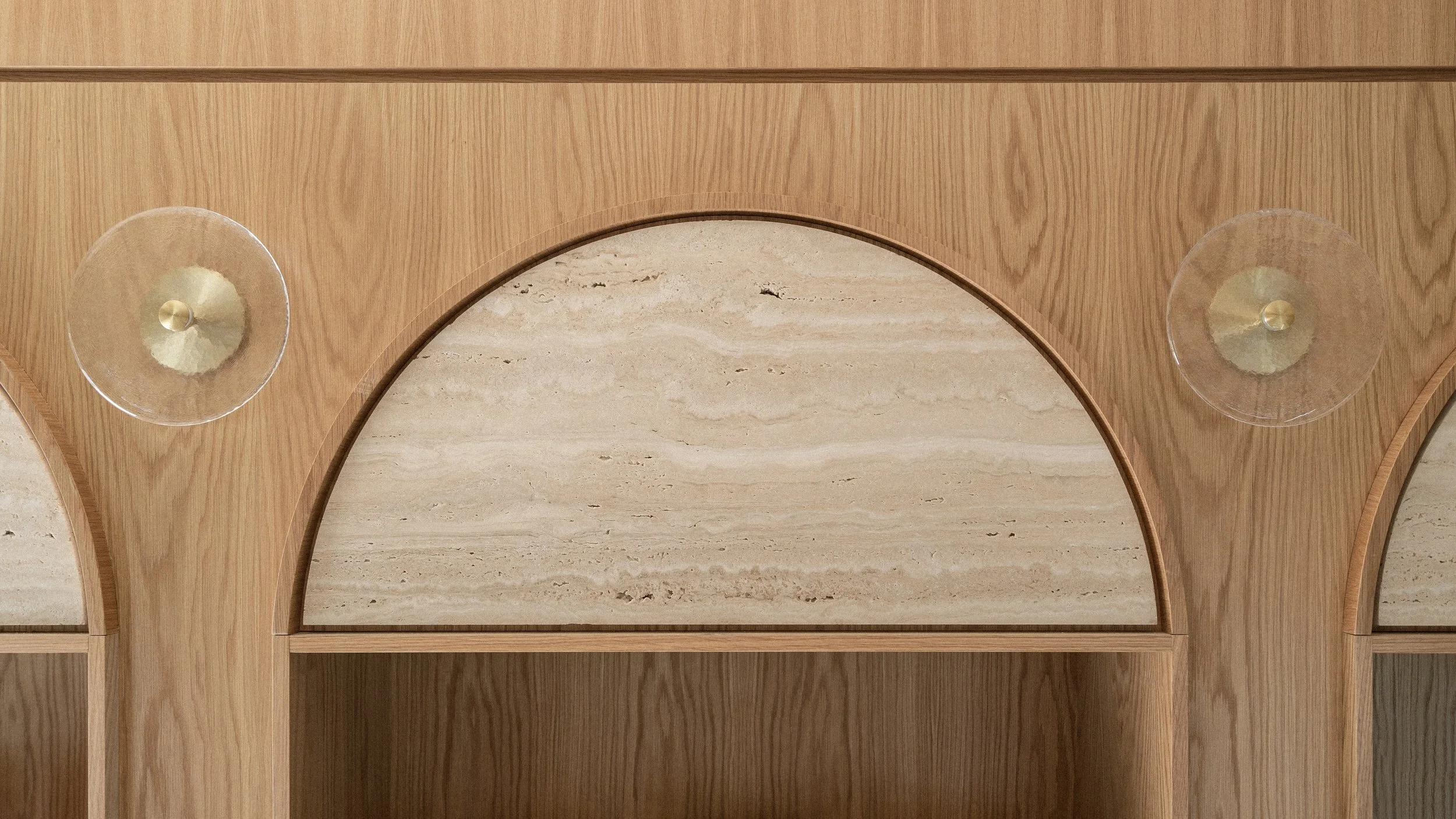 The overall interior was brought to life with divine finishes including brass accents, travertine surfaces, handmade tiles, and oak veneer plus subtle pops of colour in the carefully commissioned artwork and natural greenery. To draw the eye upwards and create a feeling of spaciousness, we made sure to optimise natural light and vertical display solutions alongside our thoughtful use of line, texture, and colour palette.